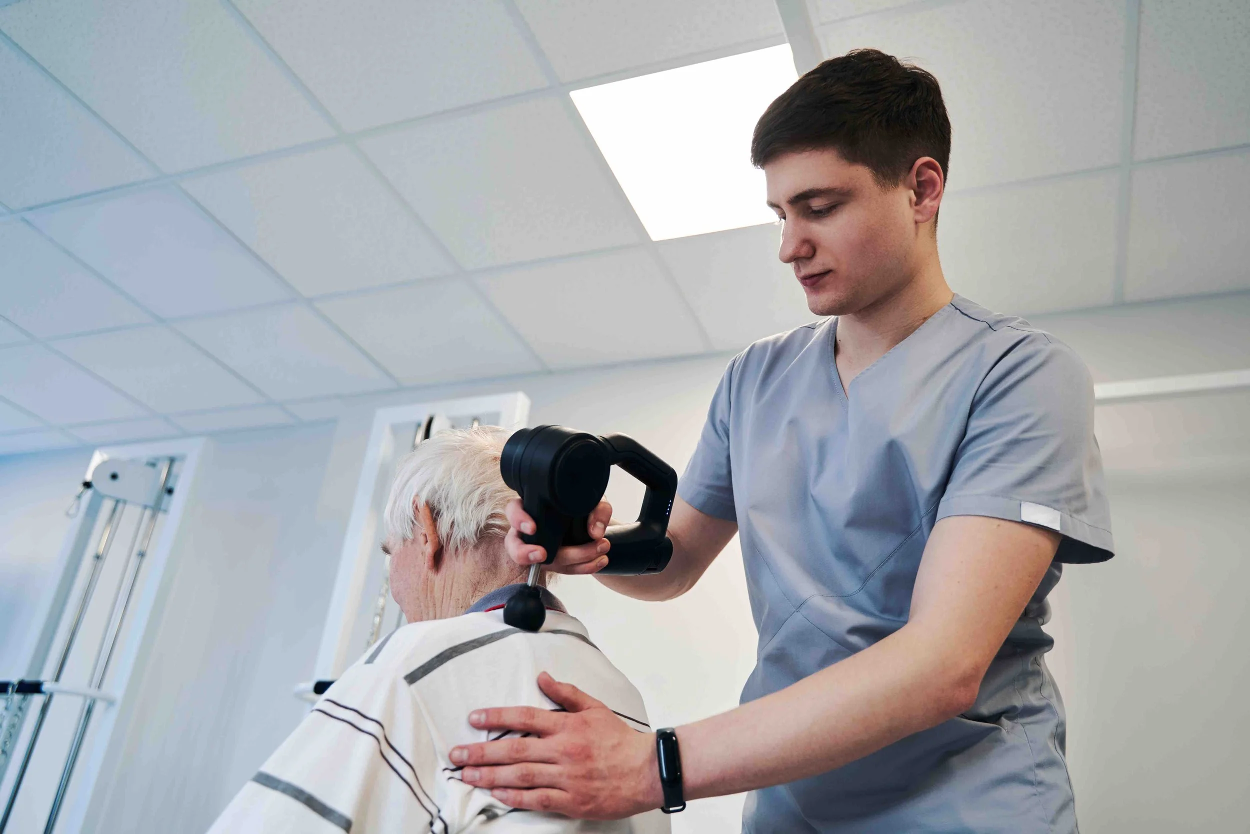 Percussive therapy is a massage technique designed to treat soft tissue pain. It is often done using a massage gun which delivers strong pulses and vibrations into the muscle tissue.